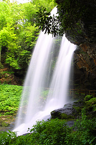The Cullasaja River falls over an overhanging ledge, allowing one to go behind the falls.