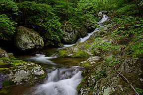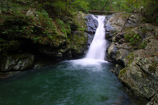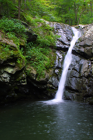 The tallest fall on Cedar Run, the stream slides down a steep rock face into a deep, wide, blue pool.