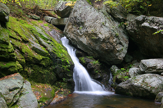 | Walking Directions | Walk the Hazel Mountain trail from the parking lot. Go straight at the first fork. At 0.4 mile the trail forks again, stay to the right to remain on the Hazel Mountain trail. At 1.4 mile, turn left on the White Rocks trail. Continue on the trail for 0.8 mile to a side trail on the right (marker has "Falls/Cave"), which leads to the base. |